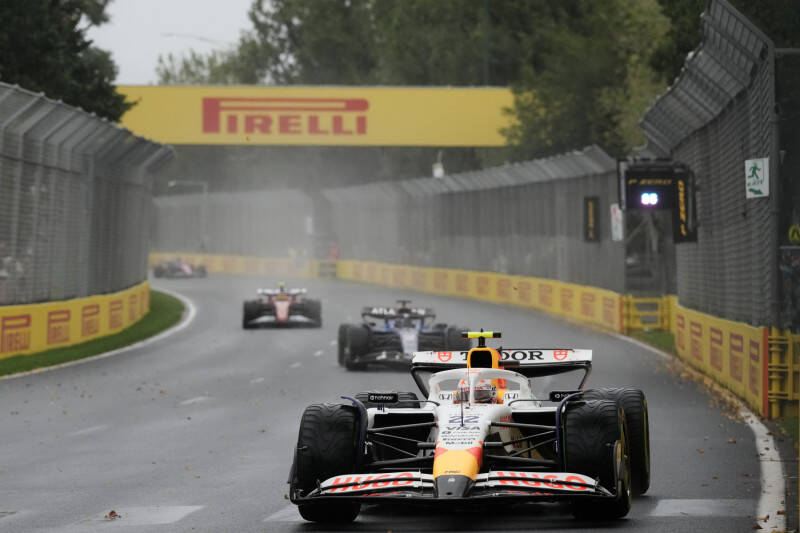 Lando kører øjeblikkeligt i pit og kommer ud efter Liam Lawson, der havde pittet tidligere. Det kostede lige en omgang eller to for briten inden han kom forbi. Max er nødt til at gå i pit. Medium i det regn duer ikke, så Lando får sin føring igen.