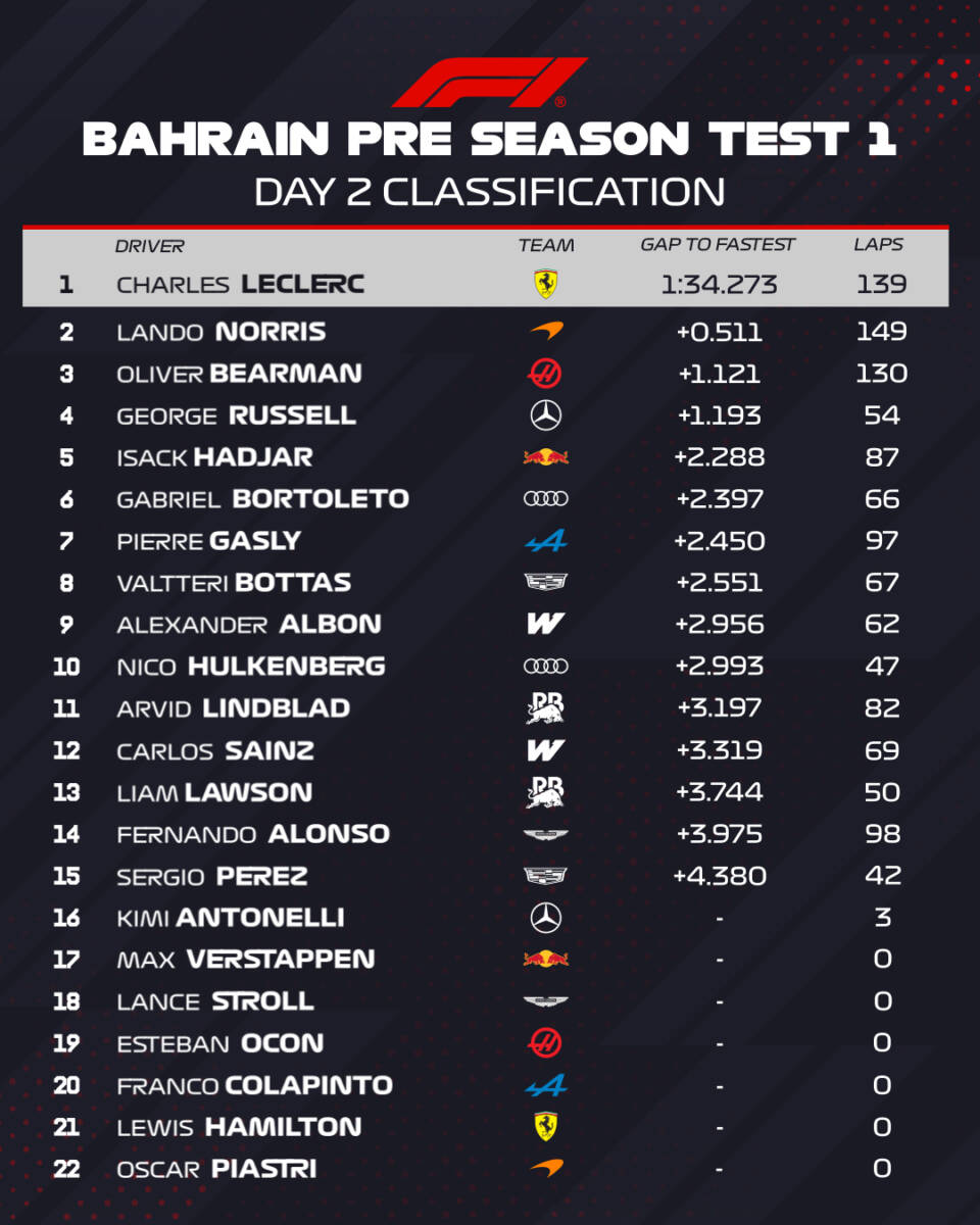 Det blev Charles Leclerc, der sluttede dagens test som hurtigste kører. Der blev kørt mange omgange, flere løbsdistancer, og kun 16 af de 22 kørere kom på banen. Max Verstappen var ikke på banen, men han skabte alligevel overskrifter.