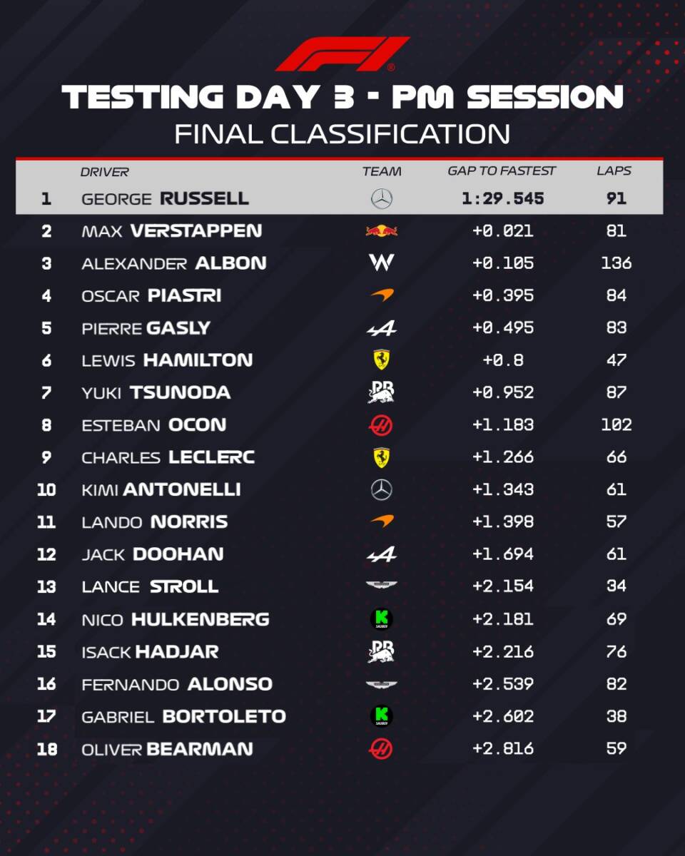 Præsæsonen er slut og det var med George Russell som testdagens hurtigste kører. Det var dog Carlos Sainz som sluttede testen som den hurtigste. Der blev kørt en del omgange igen fredag, men vi så ikke nogle Glory Runs.