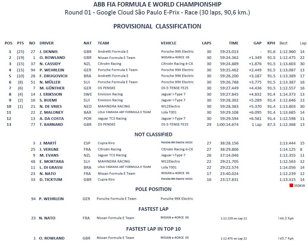 Første løb i sæson 12 blev kørt i Sao Paulo. Ikke på Interlagos, men på en gadebane i byen. Det blev et dramatisk løb med et rødt flag og en flyvende debutant. Jake Dennis startede fra pole og sluttede med det ternede flag.