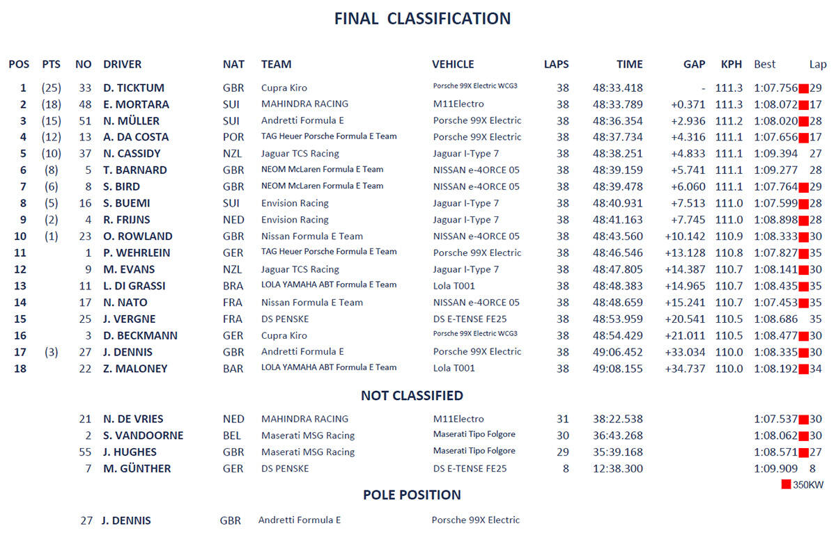 Det blev Dan Ticktum, der kom ud som sejrsherre foran Edoardo Mortara og Nico Müller, der indtog nederste podieplads, da tidsstraffe blev tilføjet resultatet.