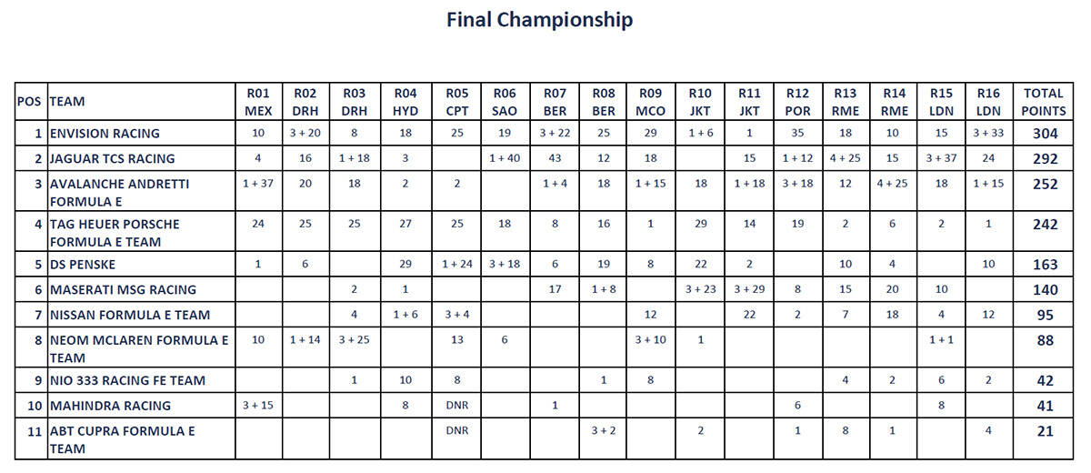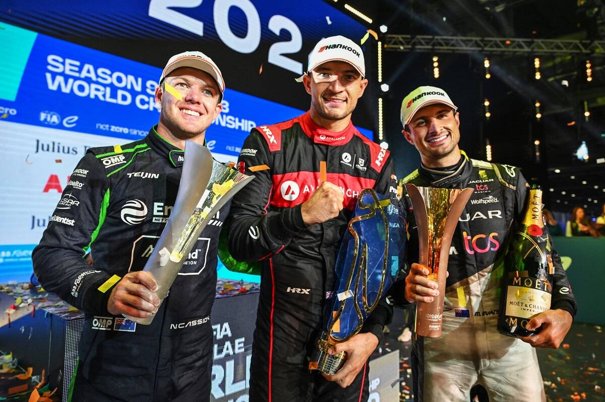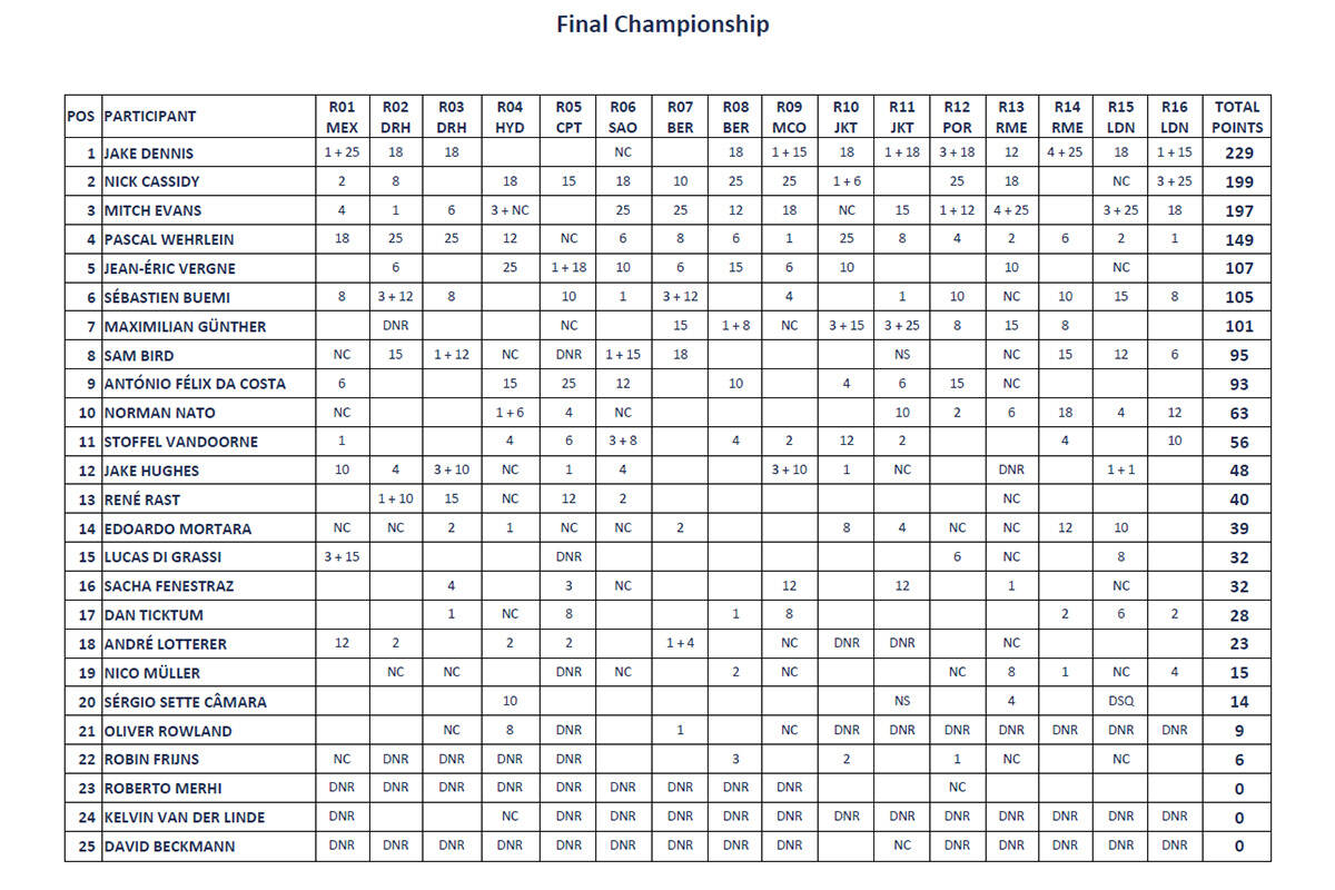 Jake Dennis i sin Andretti Avalanche Porsche tog kørermesterskabet. Nummer to og tre blev Nick Cassidy i Envision Jaguar og Mitch Evans i Jaguar.