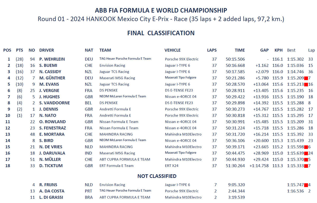 Det blev Pascal Wehrlein, der tog jubilæumssæsonens, sæson 10, første sejr i åbningsløbet i Mexico. I et kontrolleret løb holdt han Sebastien Buemi og Nick Cassidy bag sig. Kun 21 af de 22 biler stillede til start, og 18 af dem gennemførte.