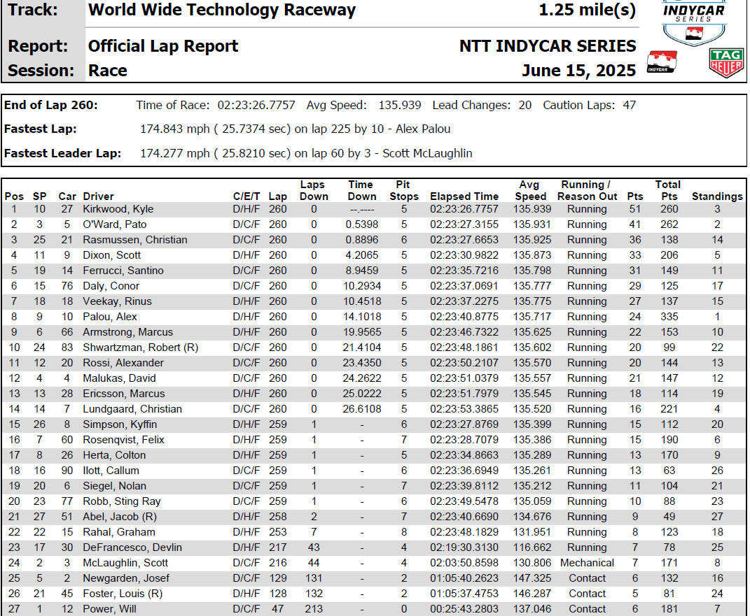 Hvem der var mest glad? Kyle Kirkwood tog sin tredje sejr i år, men sin første sejr på en ovalbane. Christian Rasmussen tog sin første podieplacering i Indycar, men Christian har i juniorklasserne vist, at han befinder sig godt på de rene venstresvingsbaner.