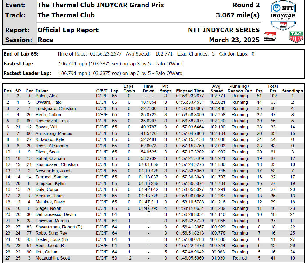 Alex Palou brugte hjernen og strategien til at vinde Thermal Club-løbet i Californien. Det som lignede en McLaren 1-2 endte næsten med en ydmygelse. Igen var dækkene afgørende og specielt hvordan man starter og slutter på dem.