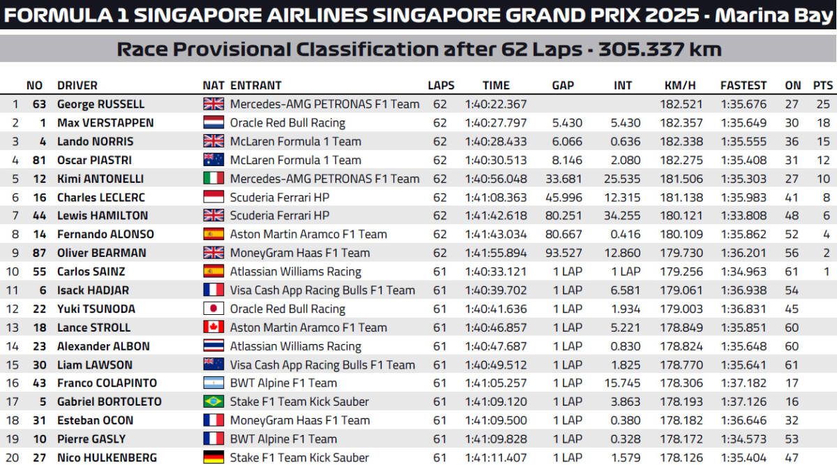 George Russell vandt løbet og fejrede det med sin sædvanlige T-pose. Et flot kørt løb af samme dominans som det canadiske grand prix. Max Verstappen viste igen, at han kan køre et løb udover bilens problemer. Lando Norris kørte sig tættere på Oscar Piastri, men kun få point, og Max Verstappen lukkede lidt af hullet til begge McLaren-kørere.
