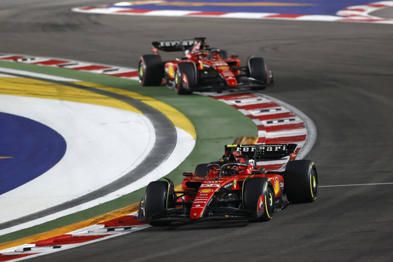 Carlos Sainz er så meget i kontrol, at han fortæller pitten, at han kan køre op mod et sekund hurtigere, hvis det skulle være. Max Verstappen tager sit eneste pitstop på omgang 41 af 62 og omgangen senere er det Sergio Perezs tur.